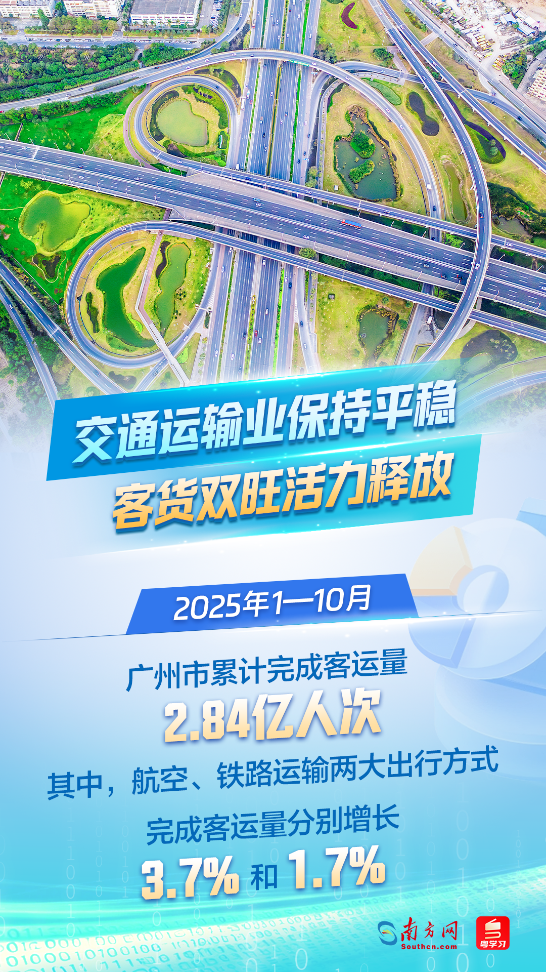 1—10月,广州市统计局发布2025年1—10月广州经济运行情况。铁路运输两大出行方式完成客运量分别增长3.7%和1.7%。制造业、航空航天器及设备制造业实现增加值增长17.7%,完成货运量7.80亿吨